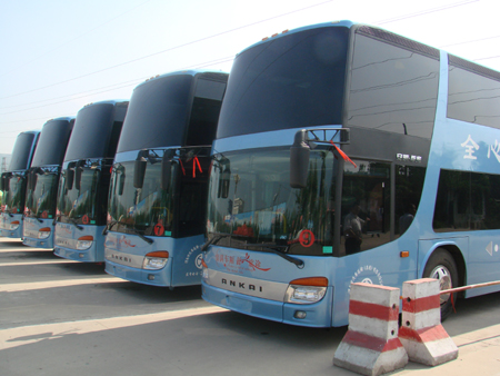 8月1日上午,公司化改造后的“西安至渭南”高速客运班线在省西安汽车站正式开通。备受各界瞩目的13辆豪华双层大巴正式投放运营(还有5辆新车未接回来,8月10日前西渭线路上保证18辆双层大巴到位,最终双层大巴数量会增加到22辆)。据悉,“西安至渭南”高速客运班线双层大巴每台单价近200万元,车辆荷载83人(包括司乘人员2个座位)。车辆更新后,原来的西安至渭南票价不变,仍为17.5元(票价14元、燃油附加费2元、站务费1.5元)。该车安全性能高,低碳节能,大大节约了燃料成本和运行成本,刹车系统装有缓速器,在高速上刹车平稳。大巴全都装有GPS系统,车内共安装4个摄像头,分别位于楼梯口、前后门。在大巴上下两层,共有7个电视供乘客欣赏。该班线每日在省西安汽车站发车,头班车时间是早7:30,末班车时间是晚8时,全天由西安、渭南两地各发车40班,间隔时间是15~20分钟发车一班。优质、舒适的乘车环境将为西渭两地旅客提供安全便捷的运输服务。