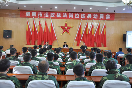 10月17上午,为期10天的渭南市运政执法岗位练兵集中训练活动拉开序幕。 为进一步深化运政执法队伍纠风整纪工作,充分展示道路运输行业执法队伍精神面貌和工作作风。渭南市运管处按照厅运管局部署,在桥南部队进行运政执法岗位练兵集训。此次执法岗位练兵集训包括队形队列训练、交通指挥手势信号训练两部分内容。来自全市运政系统55名执法骨干参加训练。市运管处处长许晓蒲在动员中要求所有参训队伍以此次集训为契机,发扬传统,重塑形象,展示风采,续写辉煌。