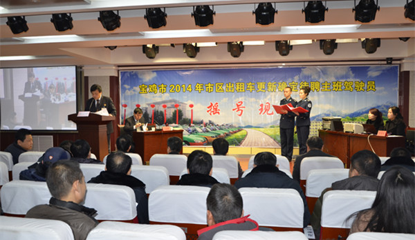 为在出租汽车行业选拔更加优秀的驾驶员,坚持公开、公平、公正的原则。宝鸡市区采取公开条件、公开报名、公开考核、公开摇号、公开结果的办法确定出租汽车主班驾驶员。1月12日至15日市区各出租车公司组织报名,经过严格核查,共有2719人参加了驾驶员招聘应知应会理论考试,依照成绩录取了2458人参加摇号,摇号产生286名待聘主班驾驶员。2014年宝鸡市区计划更新300辆出租车,招聘300名主班驾驶员,除了14个奖励性政策指标外,其余286名主班驾驶员均通过公开摇号产生。(14个奖励性政策指标:指对获得2007、2009、2011、2013年四届十佳服务明星、2013年出租行业技能大赛服务标兵称号的,一直从事市区出租驾驶工作且有从业意向的,符合报名条件要求的驾驶员,本人提出申请,经过审核、公示,由市交通运输局批准,直接确定为出租汽车主班驾驶员。)