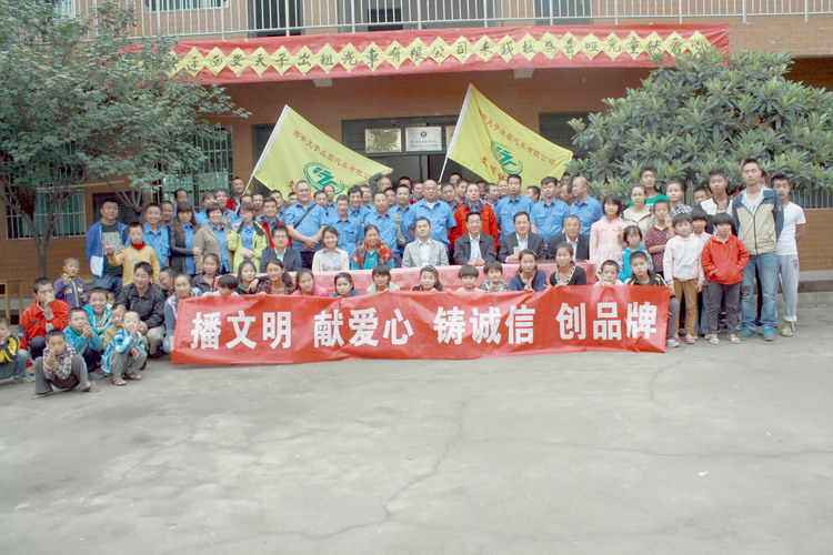 仪式结束后, 15辆文明诚信号出租车,满载慰问的米、面、油及月饼,在天子公司相关领导的带领下,列队整齐,准点发车,前往周至县聋哑学校,给生活在那里的残疾孩子奉献了爱心。车队副队长张忠义拿出了一天的营运款为孩子们购买了10箱牛奶。学校师生们热烈欢迎文明诚信号队员的到来,还表演了他们精心排练的节目。天子公司工会主席任双乐表示,文明诚信号车队将与周至聋哑学校结成长期帮扶对子,定期前去看望孩子们。