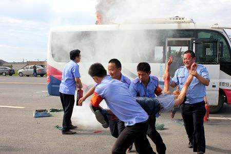 上午9时,应急演练正式开始。演练现场,公司一辆客运车辆在运行途中突然起火,司乘人员立即组织车内旅客开展自救,乘务员迅速向110指挥中心、公司报警。接到报警后,公司立即组织应急人员赶赴现场,各应急小组按照职责,密切配合,成功把旅客救出后安置到安全地带,同时,消防、救护专业队伍及时赶到,成功将大火扑灭,伤员被转移到救护车辆接受进一步救治,一起客运突发事故得到有效控制。
