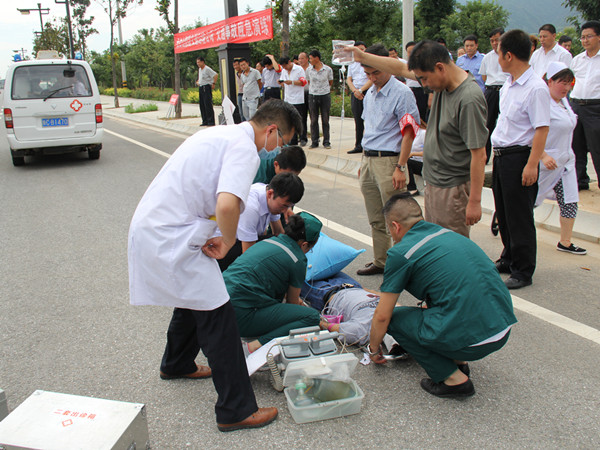 演练以太白山旅游交通公司一辆旅游客车,从景区下板寺拉运18名游客下山行驶至太白山中心大道时,为躲避前方一辆自行车紧急刹车,被紧随的一辆卡车追尾,造成一人重伤三人轻伤为交通事故模拟背景。事故发生后,旅游客车所在公司立即启动道路交通事故应急救援预案,并拨打120、122和保险公司急救报警、报案电话,同时向县运管所报告事故发生情况。随后其余各参演单位按预定方案进行了乘客疏散、事故报告、现场警戒、医疗救护、救援指挥、现场查勘等演练动作。