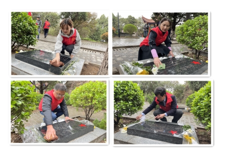 在革命烈士墓碑前,全体党员干部,俯身于烈士墓碑前,逐一擦拭墓碑上的灰尘。深切缅怀那些为国捐躯的革命先烈。