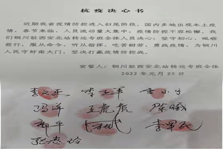 “我决心:坚守初心、砥砺前行,服从命令、听从指挥,吃苦耐劳、勇战疫情,为铜川人民守好南大门,坚决打赢疫情防控战!” 铿锵有力的誓词,传达出了铜川驻西安北客站转运专班全体党员干部职工舍小家为大家,不怕风险挑战,勇于担当牺牲的决心。