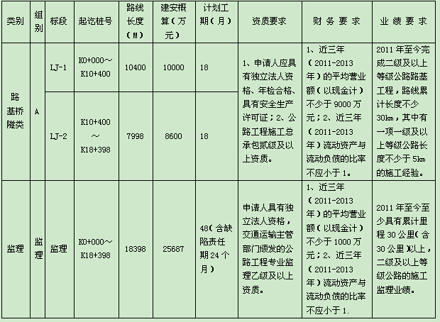 (2)标段划分及招标范围:根据本项目的工程特点,拟将路基和路面工程分批次进行招标。 本次(路基桥隧工程类)施工招标为路基桥隧类1个组别下设2个标段,工程造价约:1.86亿元。主要工程内容:路基土石方、桥梁、涵洞、防护、排水、结构物。1标段LJ-1(平梁-城关镇),路线长度10400m,2标段LJ-2(涧池镇),路线长度7998m。计划施工总工期:两个标段均为18个月,缺陷责任期24个月。