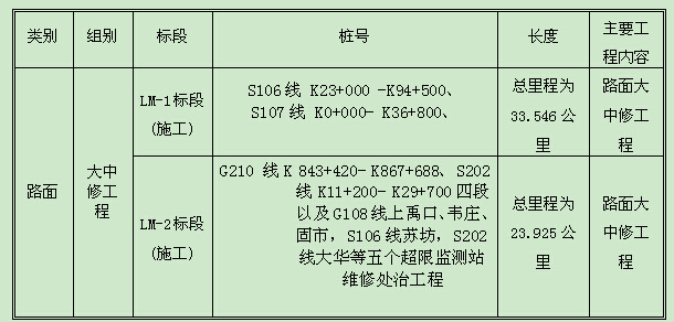 本项目分布在渭南境内G210 线K 843+420- K867+688计12.318公里、S106线 K23+000 -K94+500计21.3公里、S107线 K0+000- K36+800计12.246公里、S202 线K11+200- K29+700计11.4公里,以及G108线上禹口、韦庄、固市,S106线苏坊,S202线大华等五个超限监测站维修处治工程0.207公里,合计57.471公里。以上工程总投资15434万元。
