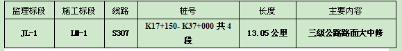 施工招标为路面类1个组别,1个标段;监理招标为1个标段。主要工程内容如下表: