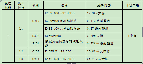 主要工程内容为大中修工程,路面类1个组别,3个标段,投资预算2.3亿元。计划2015年4月20日开工,2015年7月31日竣工,计划工期3个月。