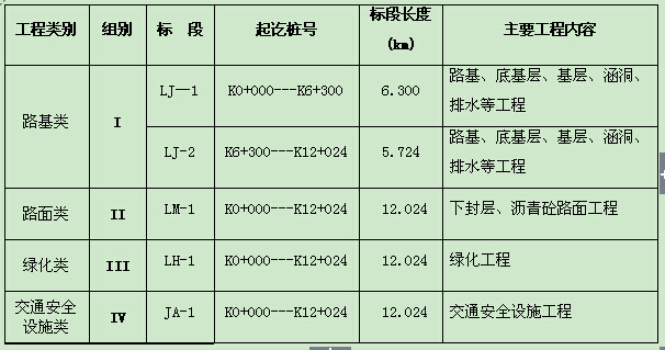 本次施工招标资格预审包含路基、路面、绿化、交通安全设施四个类别,路基类包含一个组别两个标段,路面类、绿化类、交通安全设施类各包含一个组别一个标段。具体划分详见下表: