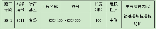 汉中市2014年水毁修复工程涉及南郑境内S211线K62+450~K62+550路基滑坡抗滑桩防护。