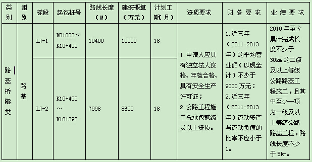 (2)标段划分及招标范围:根据本项目的工程特点,拟将路基和路面工程分批次进行招标。 本次施工招标为路基桥隧类1个组别下设2个标段,工程造价约:1.86亿元。主要工程内容:路基土石方、桥梁、涵洞、防护、排水、结构物。1标段LJ-1(平梁-城关镇),路线长度10400m,2标段LJ-2(涧池镇),路线长度7998m。计划施工总工期:两个标段均为18个月,缺陷责任期24个月。