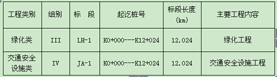 本次施工招标资格预审包含绿化、交通安全设施两个类别,绿化类、交通安全设施类均为一个组别一个标段。具体划分详见下表: