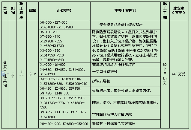 本次招标施工划分为:一个交安类别,一个组别,一个标段。