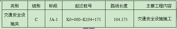 本次施工招标划为一个类别(交通安全设施类),一个组别(C组)1个标段(JA-1)施工,计划开工日期为2015年8月1日,计划竣工日期为2015年12月30日,计划工期5个月;缺陷责任期24个月。