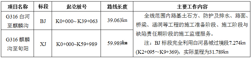 本次招标范围为全线范围内路基土石方、防护及排水、路面、桥梁、涵洞等工程的施工监理服务。G316白河至麒麟沟改建工程施工监理设1个标段BJ,G316麒麟沟至旬阳改建工程施工监理设1个标段XJ,均设置为一级监理机构,即总监理工程师办公室(简称“总监办”)。监理服务期预计为48个月,其中缺陷责任期24个月,工程施工预计开工日期为2015年7月。