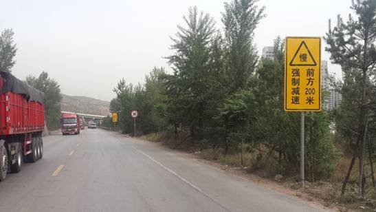 省道204杨靖线是神木县的一条重要的煤炭运输通道,沿线为神木县重要的煤炭化工区域,村庄、企业较多,车流量较大。由于K62+400-K63+000属于“S型急转弯“事故多发路段。为做好对该路段的有效管理,该段从人民群众最关心,最直接,最现实的需要出发,在该路段设置一道减速带,施划减速带提示标线,在减速带前方200米、100米处载设强制减速警示牌及减速提示牌和限速标志牌共计7块,为人民群众交通安全出行提拱了安全保护伞,有效地降低了该路段的交通安全隐患问题,收到了良好的社会效果。
