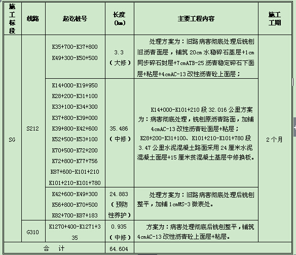 工程主要位于G310线眉县和S212线陇县、千阳县、陈仓区和渭滨区境内,全长64.604公里/16段,其中大修3.3公里/2段,中修36.421公里/11段,预防性养护24.883公里/3段,并包括涉及宝鸡渭滨区至凤县境内S212路段内示范路创建工程。总投资6285.7678万元。