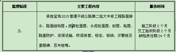 宝鸡2015年普通干线公路第二批大中修工程由陕西省公路局以《关于宝鸡2015年普通干线公路第二批大中修工程(G310线)施工图设计及预算的批复》(陕公路函〔2015〕287号)和《关于宝鸡2015年普通干线公路第二批大中修工程(S212)施工图设计及预算的批复》(陕公路函〔2015〕309号)文件批复施工图设计及预算。建设资金来自省投资,招标人为陕西省宝鸡公路管理局,招标代理机构为陕西国正建设工程项目管理有限责任公司。项目已具备招标条件。现对该项目的施工及监理进行资格后审公开招标。