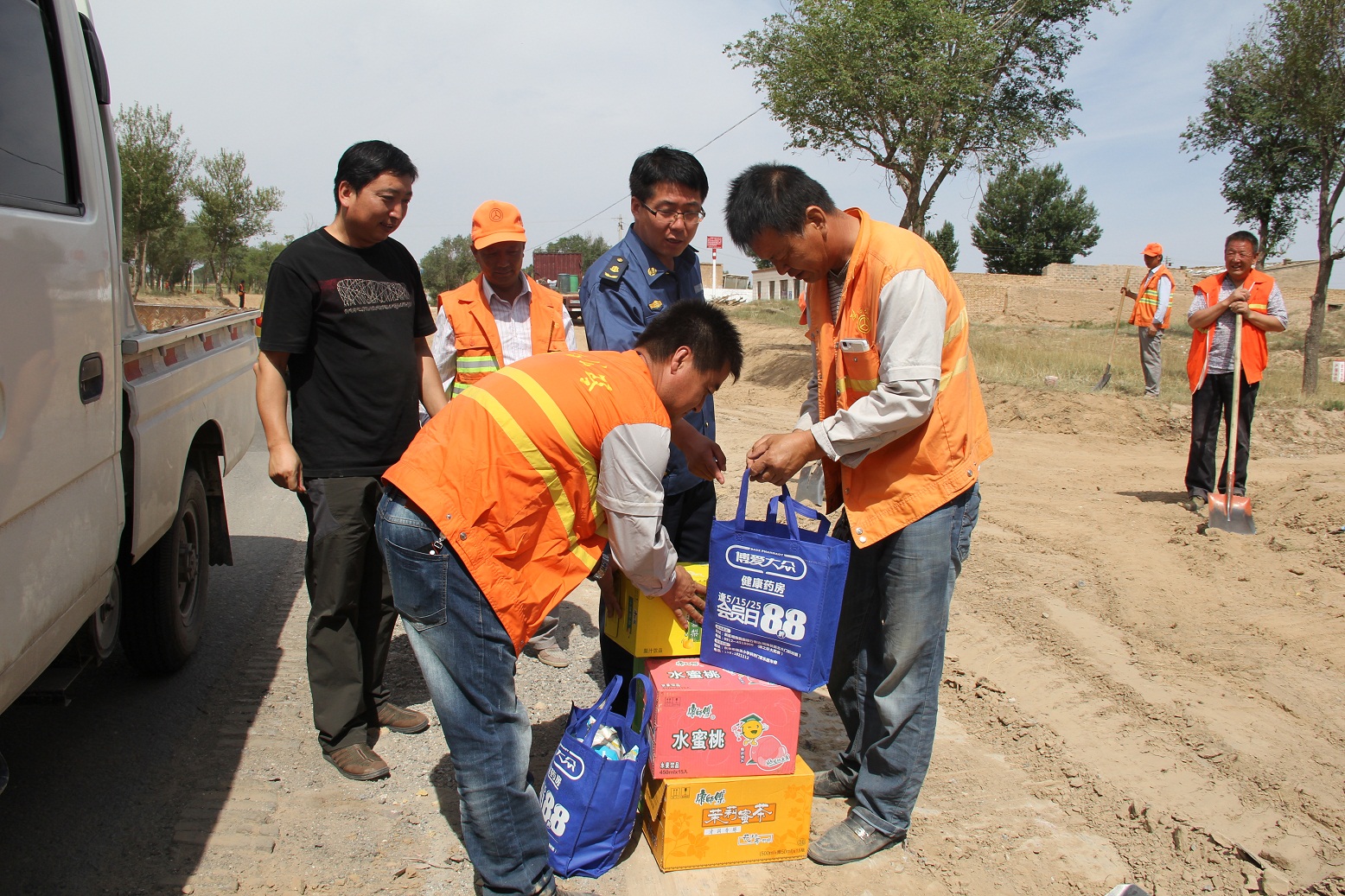 7月2日,定边公路段党政工领导深入养护一线,给高温天气下仍奋战在一线的养路职工送上板蓝根、桑夏菊、柴胡颗粒、藿香正气水等防暑降温药品和凉茶。并叮嘱各班班长在确保工作进度的同时,切实关心职工的生产和生活,合理安排好作息时间,注意防暑降温、劳逸结合。希望广大职工继续发扬吃苦耐劳、连续作战的精神,全力做好迎国检备战工作。