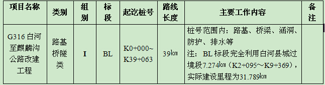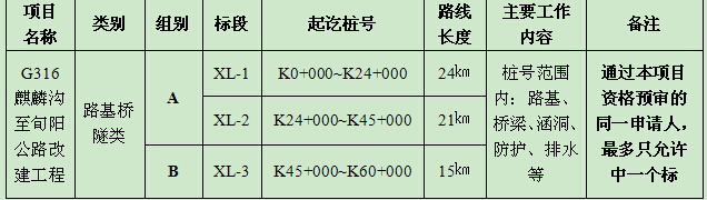 G316白河至麒麟沟和麒麟沟至旬阳公路改建工程已由陕西省发展和改革委员会以文件《关于316国道凤县灵官峡隧道及引线工程等国省干线公路改建工程可行性研究报告的批复》(陕发改基础〔2014〕1319号)批准立项,陕西省公路局以《关于316国道白河至麒麟沟公路改建工程初步设计的批复》(陕公路函〔2014〕1072号)和《关于316国道麒麟沟至旬阳公路改建工程初步设计的批复》(陕公路函〔2014〕1071号)批准建设,项目业主为安康市交通运输局(以下简称“招标人”),执行机构分别为G316白河至麒麟沟公路工程建设指挥部和G316麒麟沟至旬阳公路工程建设指挥部,招标代理机构陕西交通公路设计有限公司(以下简称“代理机构”)。本次招标两个项目建设资金均来自国家补助及市、县自筹,已具备招标条件,因第一次资格预审通过的申请人数量未能达到资格预审文件的要求,现重新对其土建工程施工进行公开招标,特邀请有兴趣的潜在投标人(以下简称“申请人”)提出资格预审申请。
