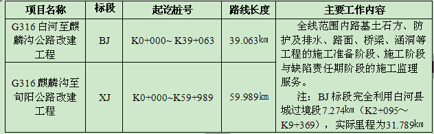 (1)G316白河至麒麟沟公路改建工程,路线起于白河县城关镇下卡子(陕鄂界),与既有316国道顺接,止于冷水镇麒麟沟(白旬界)路线全长39.06公里(其中:新建7.04公里,改建24.75公里,利用已建白河县城过境公路7.27公里),概算总投资1.8亿元。G316麒麟沟至旬阳公路改建工程,路线起于麒麟沟(旬白界),止于旬阳县灵崖寺,与既有316国道相接,路线全长59.98公里(其中新建2.0公里,改建57.98公里),概算总投资4亿元。技术标准均采用二级公路技术标准,设计速度40km/h,路基宽度8.5m,特殊困难(拆迁困难、地形复杂)路段路基宽度适当调整,新建桥梁宽度10米。