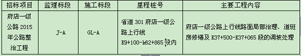 (1)本次招标项目位于省道301府店一级公路K9+100-k62+865段内,主要工程内容为省道301府店一级公路上行线K9+100-k62+865段内的路面局部治理、道班房修缮及K37+500-K37+065段的调坡处理。