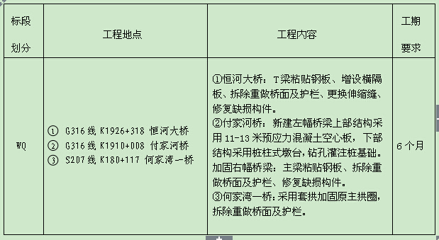 本项目位于安康市境内的G316、 S207二条干线公路,本次招标施工划分为:桥梁一个组别、一个标段(WQ标)。项目总投资1184万元,工期均为6个月,工程内容如下: