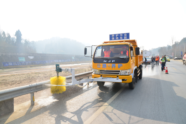 (图为该段自主研制的波形护栏清洗及绿化养护洒水车正在清洗作业)