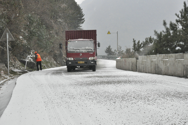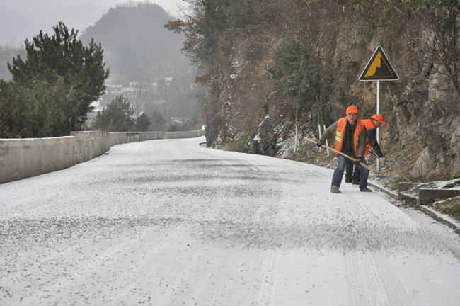 1月20日,镇巴境内普降大雪,国道210线大毛垭、小毛垭、拴马岭等路段不同程度积雪结冰,极大影响过往车辆正常通行。 镇巴公路管理段立即启动防滑保畅预案,迅速组织3支应急小分队前往积雪结冰路段铲雪、除冰,全力做好防滑保畅工作,并组织道工在陡坡急弯路段抛洒防滑砂,有效保障辖养道路安全畅通。(图为该段职工在积雪结冰路段抛洒防滑料)