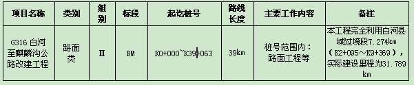 1)项目概况:路线起于白河县城关镇下卡子(陕鄂界),与既有316国道顺接,止于冷水镇麒麟沟(白旬界)路线全长39.06公里(其中:新建7.04公里,改建24.75公里,利用已建白河县城过境公路7.27公里),概算总投资1.8亿元。技术标准均采用二级公路技术标准,设计速度40km/h,路基宽度8.5m,特殊困难(拆迁困难、地形复杂)路段路基宽度适当调整,新建桥梁宽度10米。