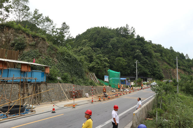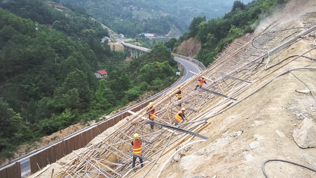 该工程位于210国道西乡县穿心店村,滑塌边坡长244米,最大坡高65米,受雨水冲刷、土体松软风化等因素影响,路基边坡不时有塌方、落石等情况发生,存在重大安全隐患;汉中公路局于今年4月组建水毁工程项目部负责项目管理,整治方案为对坡体分七级进行清方卸载,坡面采用锚索(杆)框架梁进行综合治理,实行半封闭式施工;参建人员第一时间进驻工地,冒险情,战风雨,昼夜轮番施工,全力投入施工抢险,在相关部门大力支持配合下,工程进展顺利;已累计完成锚杆(锚索)钻孔、安装660个/8478米,占工程量45%;完成五、六、七级边坡格构梁钢筋骨架安装,占工程量32%;完成七级边坡格构梁模板安装、C30砼浇筑60m3,项目完工后将有效确保坡底村民和210国道行车安全。