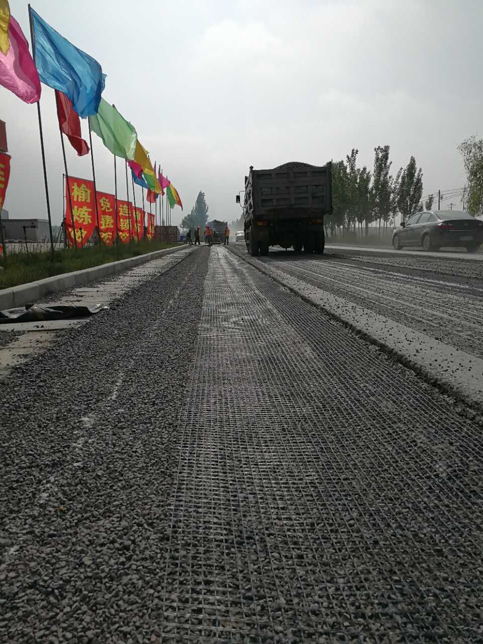 6月22日,国道307大中修工程中修段下面层加宽工程顺利开工。在新旧基层搭接处,为了防止路面产生纵向裂缝,该下面层采用新工艺加了防裂土工格栅,采用小型轮胎摊铺机铺筑下面层取得了良好的效果。