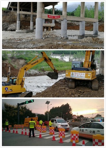 险情发生后,西安市交通局张健局长立即带领杨党校总工及西安公路局康晓革局长等相关部门负责人赶赴现场指挥防汛抢险工作,与长安大学、西安公路勘察设计院专家一同研究抢险方案,同时对桥梁安全性进行评估,初步认为涝峪河大桥目前处于较为安全运行状态。按照张健局长指示和专家建议,西安公路局局紧急制定防护方案,调集人员、机械设备,开挖3号墩至4号墩之间河道,将洪水向3号墩至4号墩方向导流,同时在1号墩护岸位置采取抛石防护措施,减少洪水对1号墩方向的冲刷,最大限度降低次生灾害发生。