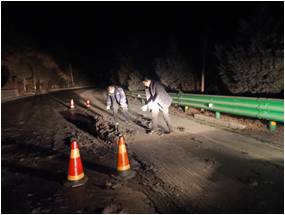 接到举报后,该段立即启动应急预案,路政和养护人员第一时间赶赴现场进行处置。由于现场污染面积大、来往车辆多,该段立即组织路政人员疏导交通,摆放安全桶,提醒过往车辆谨慎驾驶,并安排养护人员使用铁铲、扫帚等工具及时清理路面污染,保障了道路畅通。同时,该段进一步加强路警联动,采取积极有效措施,对来往车辆及时进行排查,通过不懈努力,终于锁定抛洒车辆,并对其污染路面的违规行为进行了教育和处罚,有效保护了路产路权,维护路容路貌的整洁。