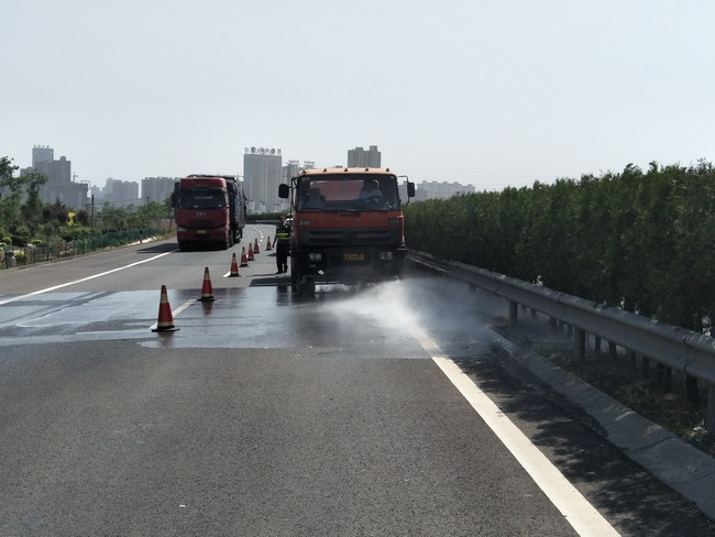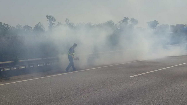 2017年5月12日下午14:16分,韩城路政中队巡查一班接有关部门通知,K853-K854之间中分带绿篱着火,要求立即处置,巡查班迅速赶往事发地点,发现中分带绿篱着火约十余米,由于现场浓烟滚滚,过往车辆因视线不清均降低车速,缓慢通过,路政人员立即使用随车配置的灭火器进行扑灭,再用泥土覆盖。明火虽已扑灭,但是余火及浓烟短时间无法清除,路政人员立即向值班领导汇报并协调管理所水车上路协助灭火。经过各方努力配合,火灾于15:20被完全扑灭,保证了高速公路的安全畅通。