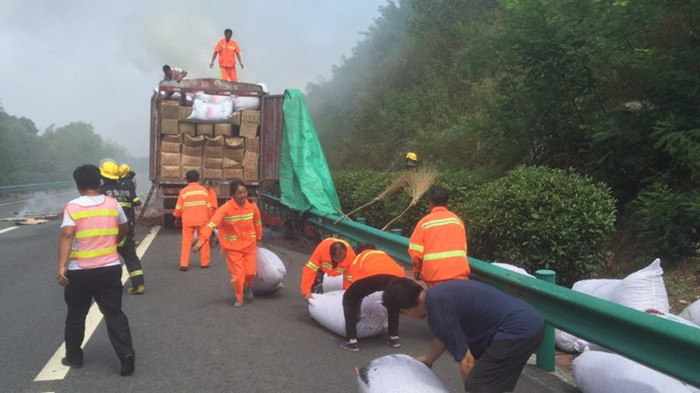 当天上午10时53分,路政巡查人员接到报案称所辖路段K262+850m天水方向有一辆货车着火,路警人员接到报案后迅速出动赶往现场,同时拨打消防火警电话,快速处置事故现场。一是领导重视,指挥得当。事故发生后管理所领导、中队长第一时间赶到现场,迅速启动突发事件应急预案,协调多方,人员、物资及时到位;二是快速反应,处置得当。接到报案后,路警人员15分钟到达现场,对道路进行临时交通管制,维持现场秩序,组织人员安全撤离,利用消防器材控制火势,对应急车道进行疏通,消防火警到达现场快速控制火势,在火势得到控制后,组织人员对车辆货物进行转移,防止火势再次复燃,降低了司机经济损失;三是多方联动、确保畅通。事故发生后,道路临时中断,路警人员及时在汉阴收费站出口进行分流,汉阴收费站和池河收费站开启全部车道,确保分流车辆快速通行;四是争分夺秒,恢复通行。组织人员将超车道散落货物及燃烧残留物进行清理,确保车辆缓慢通行,同时,协助施救人员进行清障。