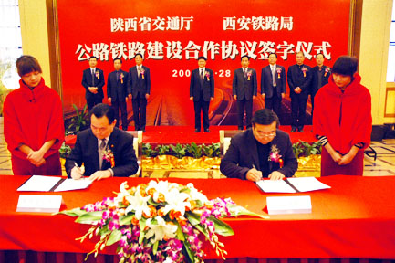 12月28日,陕西省交通厅和西安铁路局签定了公路铁路交叉合作框架协议,对公路铁路建设中衔接部分的投资划分、收费问题、施工时间等进行了详细规定。省委常委、副省长洪峰等领导出席签字仪式。
