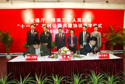 4月26日,省交通厅分别与安康、汉中、商洛三市人民政府签订 “十一五”农村公路共建协议,进一步落实省部《关于落实中央1号文件农村公路建设任务意见》,修好通村路,服务新农村。省人民政府洪峰副省长出席签字仪式。