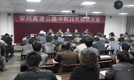 为确保安川高速公路12月28日建成通车标,根据省厅 “关于组织开展安毛川高速公路项目通车大会战有关事项的通知”,开展以“贯通米溪梁隧道,确保按期建成通”为目标的大会战活动,成立由交建集团、厅外资办组成的大会战指挥部。指挥部根据目前尾留工程特别是米溪梁隧道进展情况,11月18日在紫阳召开了安川高速公路冲刺30天动员大会。厅重点工程督导组组长万振江、副组长范建华、安康市协调办、汉滨区协调办、紫阳县协调办和交建集团、青兰管理处、安康分公司部分人员;施工单位的项目经理、总工、总监办总监、各驻地监理工程师及安川管理处全体人员共120人参加了会议。