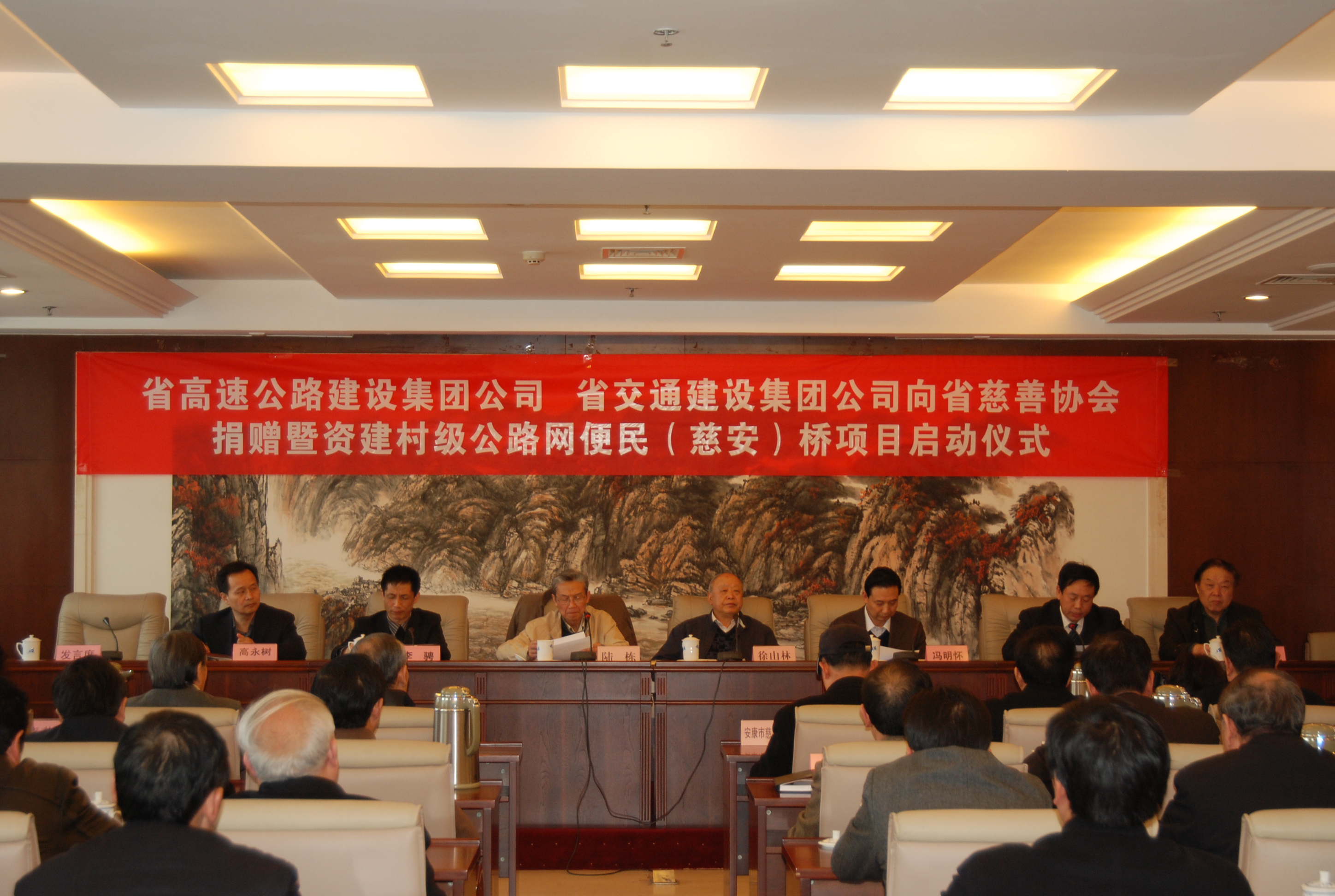 省慈善协会在省政府举行省高速集团、省交通集团向省慈善协会捐款暨资建村级公路网便民(慈安)桥项目启动仪式。省慈善协会会长徐山林、省交通运输厅总工程师冯明怀、省高速集团总会计师李骋、省交通集团副总经理万义元出席启动仪式并讲话,省慈善协会名誉会长陆栋主持启动仪式,省公路局副局长高永树及安康、汉中、商洛三市和受助县慈协、交通部门有关领导参加。