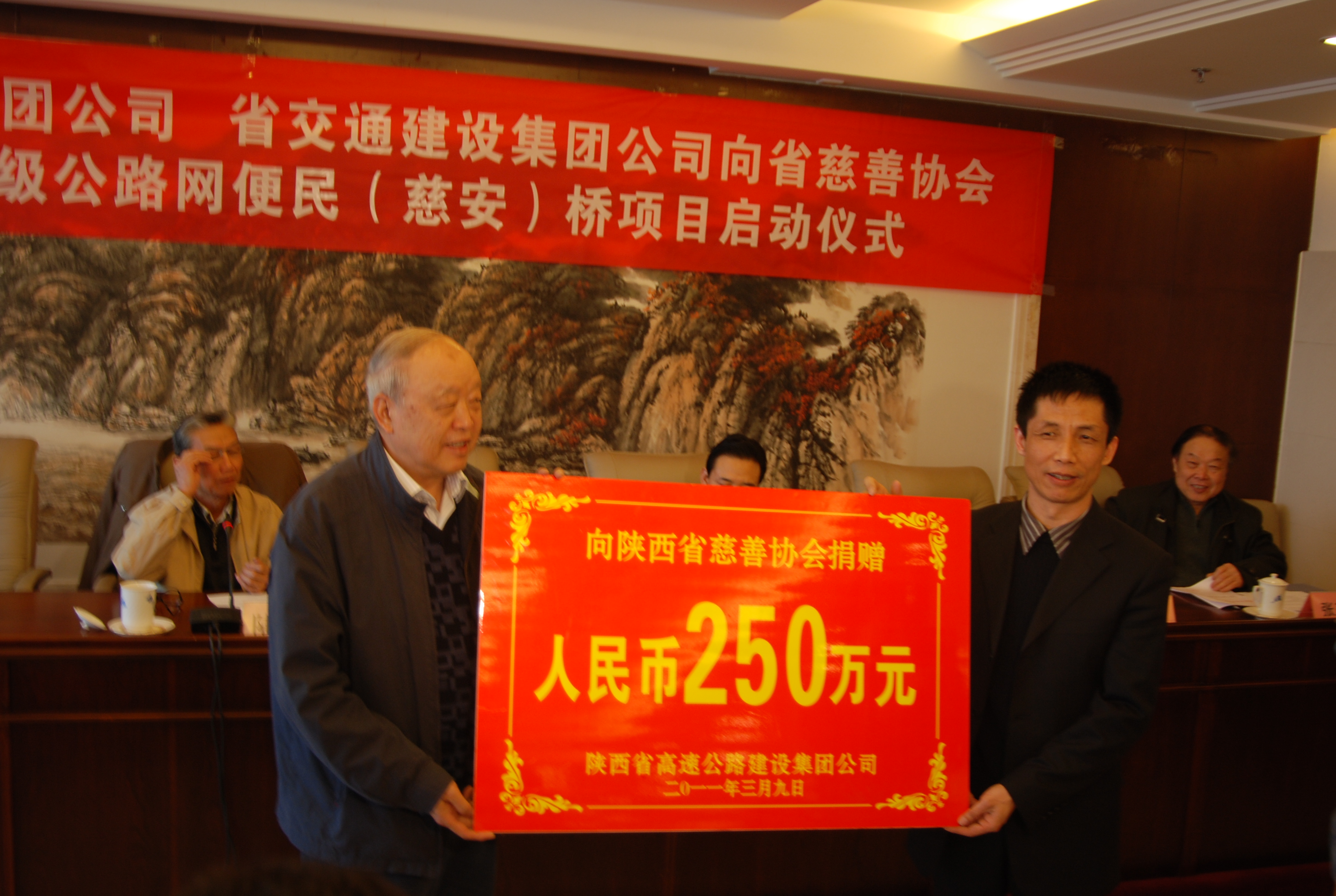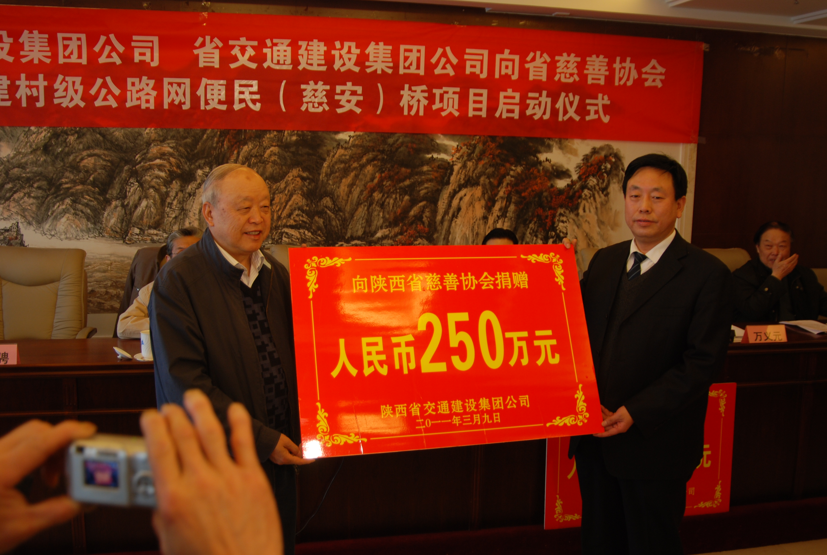 为支持陕南贫困山区交通建设,经省交通运输厅协调,省高速集团、省交通集团分别向省慈善协会各捐资250万元,用于陕南山区联结村级公路便民桥(慈安桥)建设,帮助村民尤其是学生解决通行困难问题。500万元捐款共安排建桥50座,分配安康市20座,汉中市15座,商洛市15座,涉及26个县。资助建设的桥梁要求建设规模总投资在10万元以上,桥型为石拱桥、平板桥,桥梁承重标准为10吨以上,省慈善协会为每座桥梁资助10万元,不足部分由所在地自筹解决。捐建的桥梁原则上要求于2011年底建成并投入使用。