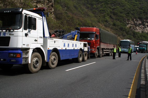 9时30分路政制式巡查车、消防车、120救护车、清障车从不同点位在“事故”现场集结,对事故车辆进行救援,查看事故车上人员的受伤情况,120救护车救援伤员;处理事故交警对现场进行了勘察,路政人员对路产进行拍照勘验。清障车对“事故”车辆进行拖离准备工作,同时满载锥形桶和警示标志的轻型卡车赶赴分流路段,路政人员在分流路段设置警示标志,摆放单幅双向中央隔离标志桶,做好单幅双向分流的准备工作。