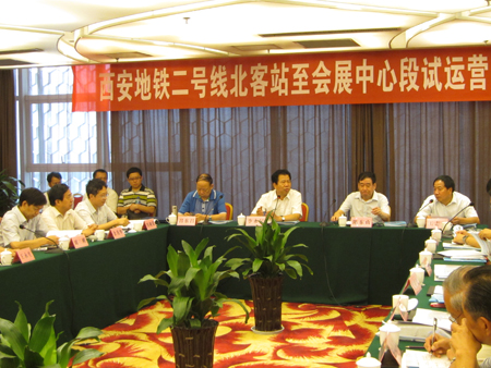 8月14日,西安地铁二号线试运营基本条件评审会在西安召开,由15名城市轨道交通专家组成的专家组对西安地铁二号线试运营基本条件进行评审。省交通运输厅李永民副厅长、吕东昌副巡视员、运输处冯利荣处长、安检处余茂华处长、厅运管局刘三刚局长参加了会议。专家组听取了西安市地铁办关于二号线建设情况和试运营准备工作综合报告。实地查看了地铁二号线通讯系统、票务系统及运营情况。李永民副厅长强调,城市轨道交通管理机构要组织专业机构认真开展试运营基本条件评审工作,并将评审结果向交通运输部备案。西安市地铁办主任、西安市地铁有限责任公司总经理陈东山表示,经过西安市地铁运营分公司的努力,地铁二号线试运营工作已基本就绪,满足试运营的基本条件。评审会后,运营分公司将按照专家组的意见进一步完善试运营准备工作,力争在较短时间内达到试运营要求,确保二号线安全、有序开通试运营。
