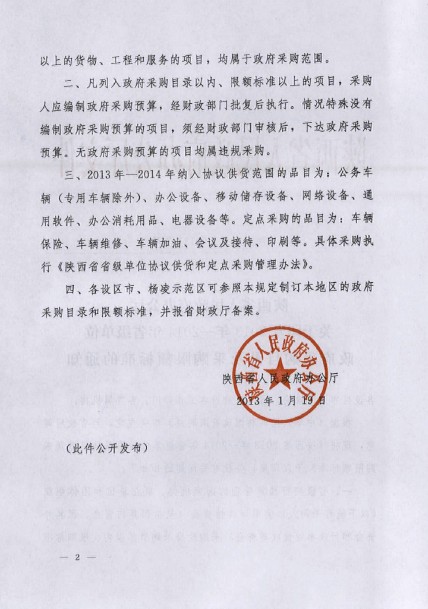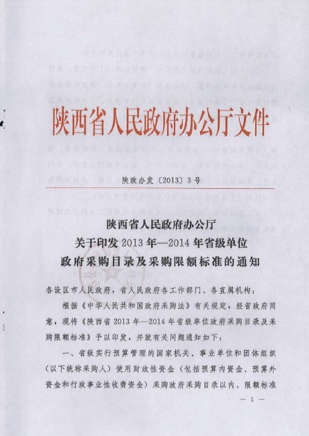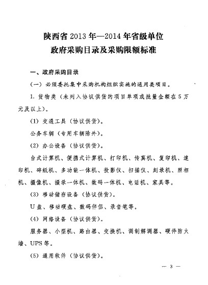 现将《陕西省人民政府办公厅关于印发2013年—2014年省级单位政府采购目录及采购限额标准的通知》(陕政办发〔2013〕3号)转发给你们,并将有关要求通知如下,请一并遵照执行。