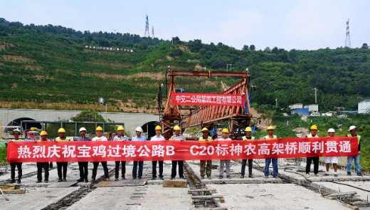 神农高架桥作为宝鸡过境公路的控制性工程,起于冯家塬隧道出口,止于陈仓隧道入口,桥梁全长1800多米,与宝兰高铁并行布设。因跨铁路影响,剩余40片梁板一直未能架设。为了保证顺利施工,宝鸡过境公路管理处积极与铁路部门沟通协调,铁路部门一共提供了38个‘天窗点’作业时间,每个“天窗点”只有2-3小时,加起来约90个小时。8月9日,神农高架桥跨铁路预制箱梁架设施工正式启动,经过21天13个“天窗点”30.5个小时的高效施工组织,先于8月29日顺利完成了该桥左幅的合龙。施工过程中,每天早上5点开工,不到7点就要将当天需要架设梁全部运输到位,为了确保梁板架设顺利,现场成立应急保卫、物资调配、后勤保障、技术指导4个小组,配备2台100吨吊车、1台挖掘机、1台200千瓦发电机作为应急设备。为了在有限的时间里抢工期,架梁、钢筋焊接、模板拼装、混凝土浇筑4项作业同时交叉进行。同时,宝鸡车务段、宝鸡工务段、西安通信段等铁路单位积极配合施工作业。