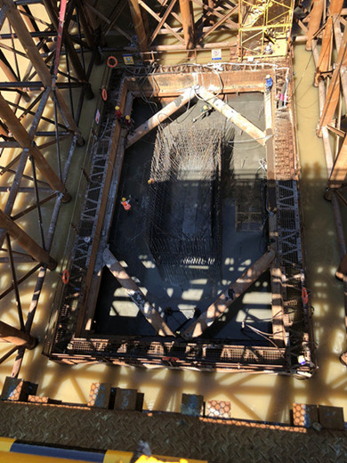 汉江特大桥采用140米跨径波形钢腹板预应力砼连续刚构,是西北地区目前跨径最大的波形钢腹板桥,其中3号、4号墩基础均为水中基础,所处位置为国家一级水源保护地,河床为裸岩地质,承台施工采用双壁钢围堰施工,围堰尺寸为17.2×9.7×8米,直接作为承台模板使用,承台尺寸为17.1×9.6×4米,单个承台设计方量为656方混凝土。