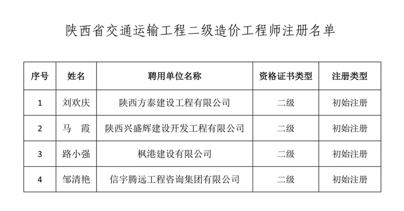 附件:陕西省交通运输工程二级造价工程师注册名单