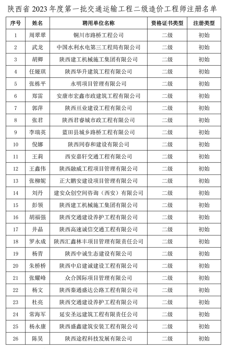 附件:陕西省2023年度第一批交通运输工程二级造价工程师注册名单