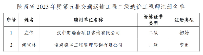 陕西省交通运输工程造价事务中心关于陕西省2023年度第五批交通运输工程二级造价工程师注册名单的公示