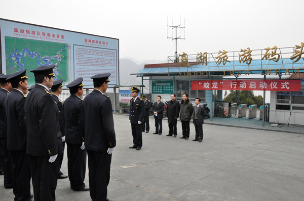 3月6日,安康市地方海事局组织开展代号“蛟龙”的水路交通综合执法行动在安康赢湖码头正式启动。安康市交通运输局、安全监督管理局等领导出席启动仪式。此次“蛟龙”行动由安康市地方海事局抽调8县区26名海事执法人员参与,为期一周。行动期间将按照依法治理与宣传并重,行政处罚与教育相结合的原则,以安康瀛湖库区119公里航道水域范围的船舶、船员、水运企业为治理重点,主要检查船舶和船员证书是否合法有效;查处船舶超载超员、“三无”船舶非法载客、无证驾驶、夜航及非法运输危险品等违法行为;严厉打击滩途造船;整治通航水域内违法施工作业碍航和影响水上安全生产的经营活动。旨在进一步强化水路运输市场综合监管,遏制水上交通事故发生,集中解决当前水上交通安全存在的突出问题,切实维护水上安全,促进全市水上交通事业健康安全有序发展。为确保此次行动取得实效,安康市交通运输局和市地方海事局还成立了“蛟龙”行动领导小组,领导小组下设指挥部,并设立了行动、处置、后勤、宣传四个工作组。同时行动期间实行半军事化管理,安排专职督察人员,负责执法人员的工作纪律和风纪督查。
